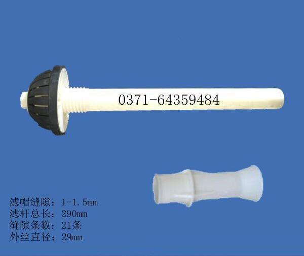 長柄濾頭主要適用于過濾裝置底部配水系統濾板上固定安裝使用實現汽水反沖洗作用,在濾頭濾帽弧面上均勻設計長條細縫,既能防止濾料的漏出,又能確保配氣和配水均勻。濾桿是一根塑料管頂端開有一個小孔,靠近底部有二條進氣條縫,壓縮空氣進入濾板下面的空間后,緩慢地形成空氣層,并逐漸變厚,空氣層下面的水不斷下降,直到水面降至濾桿下部的長條進氣條縫處時,這時空氣開始由條縫孔流入濾桿。當流進的空氣流量與經濾帽縫隙流流走的流量相等時,水面便停止下降,穩定在一定位置上,進入的空氣經濾桿上升通過濾帽的縫隙噴射到濾料層中去,由于多個濾頭的交叉噴射均勻分布,達到良好的反沖洗效果。注:(一般視集污槽水變清,即可停止反沖洗,盡量控制和減少反沖水不必要的損耗)。