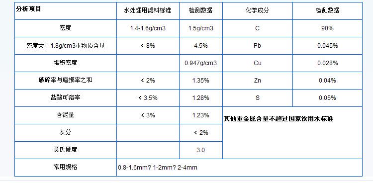 無煙煤濾料在水處理中起的作用好壞,直接影響濾過的水質(zhì),所以在選擇無煙煤濾料的時(shí)候,質(zhì)量必須符合國家相關(guān)標(biāo)準(zhǔn)。下為建設(shè)部水處理濾料監(jiān)督檢測(cè)中心頒布的CJ/T43 -2005《水處理用濾料》中無煙煤濾料的相關(guān)標(biāo)準(zhǔn)。
