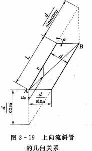 以上向流斜管沉淀池為例,分析沉淀區(qū)斜管尺寸問(wèn)題,下向流斜管斜板沉淀池原理與此相同,不多敘述。為了分析方便,取上向流斜管為矩形,斜管的縱剖面如圖3-19所示;