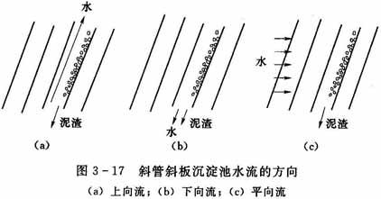在斜板斜管沉淀池中,按照水流流過(guò)斜板的方向,可分為上向流、下向流和平向流三種,如圖3-17和圖3-18所示。水流由下向上通過(guò)斜管或斜板,沉淀物由上向下,它們的方向正好相反,這種形式稱(chēng)作上向流(也稱(chēng)異向流)。水流向下通過(guò)斜管或斜板與沉淀