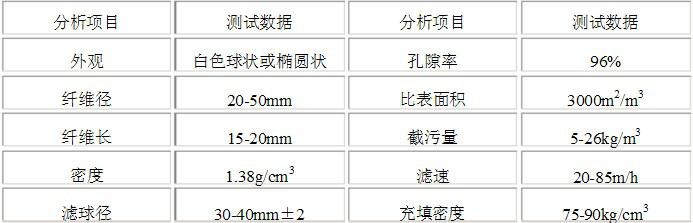 纖維球是一種用聚脂纖維制成的新型球狀濾料,其纖維直徑20~25μm,濾球直徑10~30mm,密度1.38g/cm3,空隙率